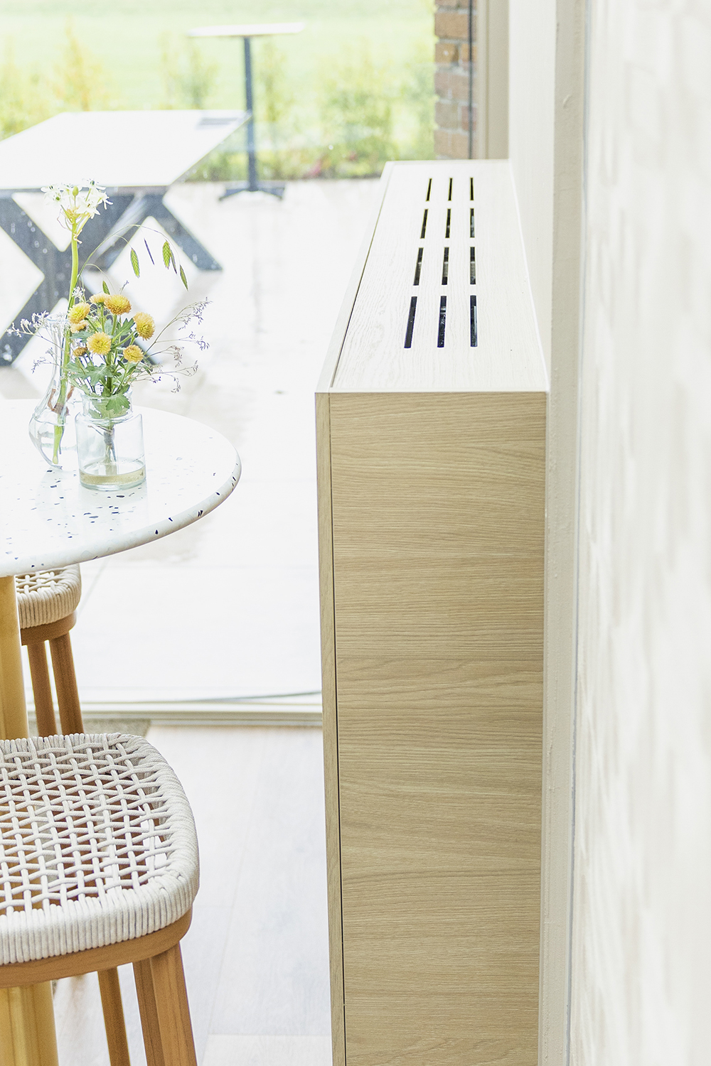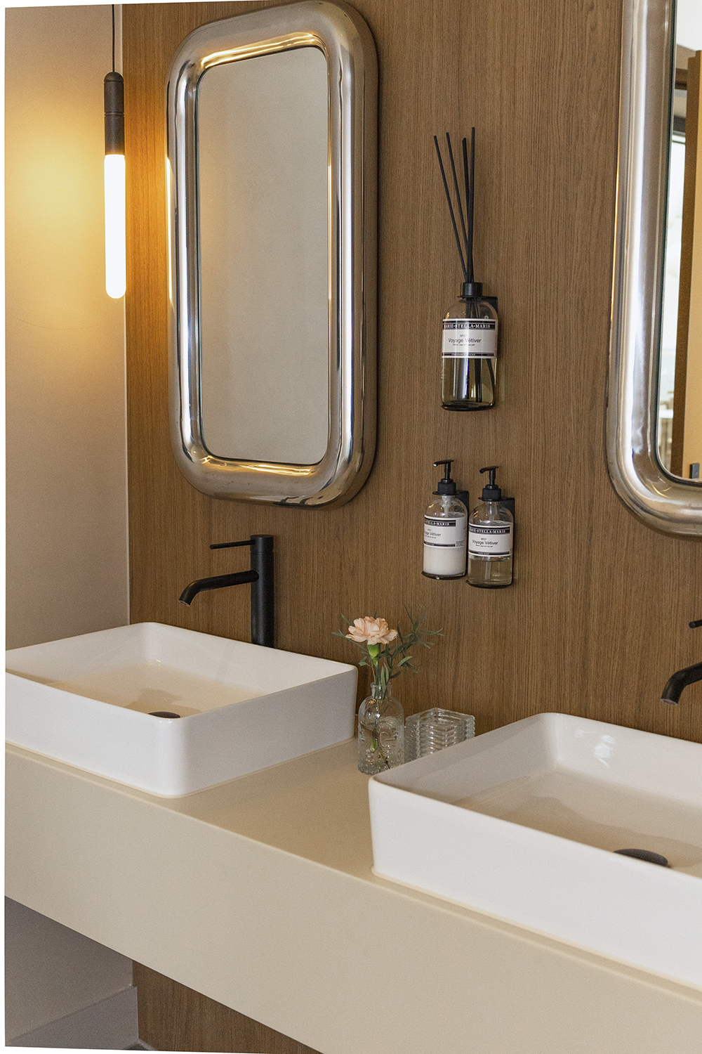 Door het gebruik van natuurlijke materialen, met name hout, ademt de ruimte een rustgevende, organische sfeer. Subtiele details, harmonieuze kleuren en zorgvuldig gekozen vormen versterken de beleving en maken het geheel uitnodigend en comfortabel voor iedere gast.